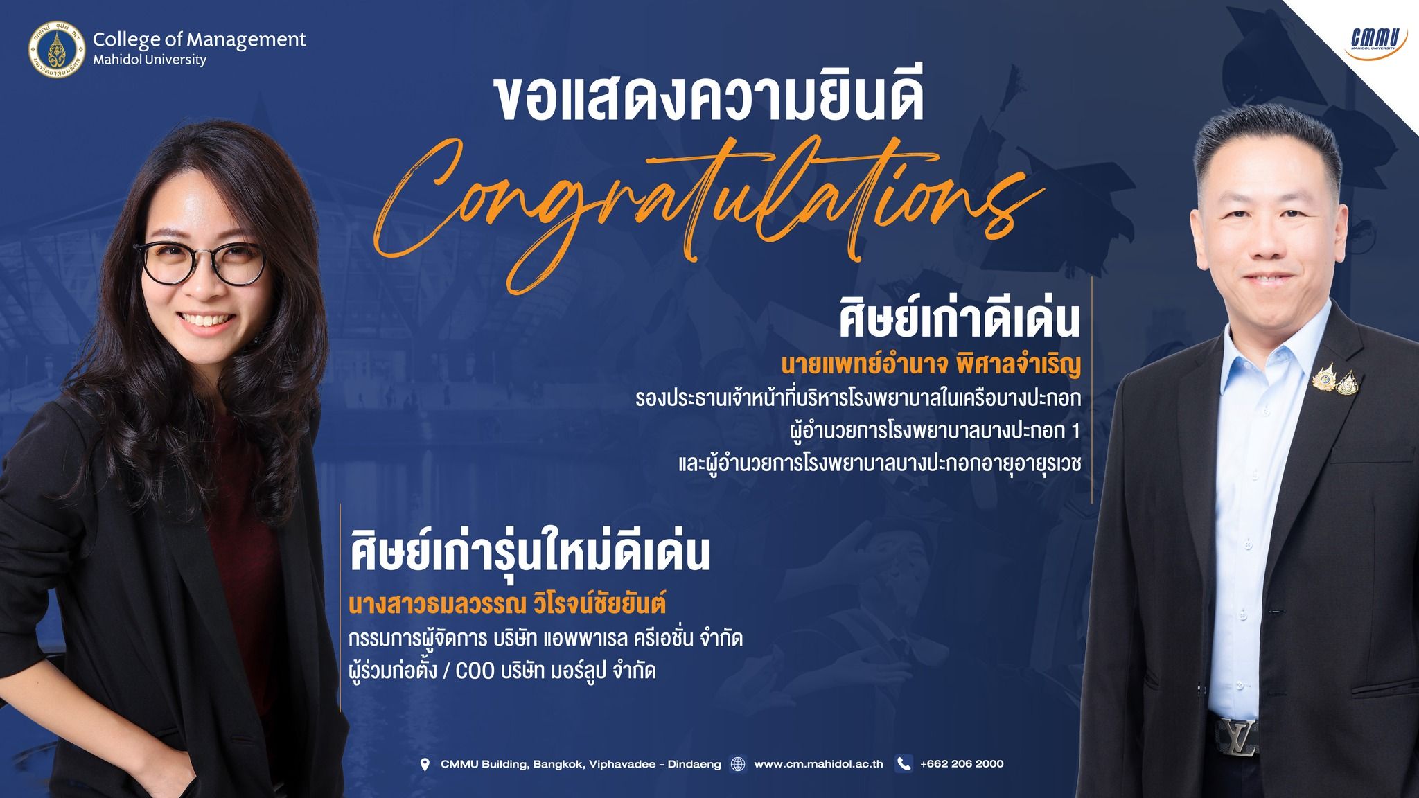 วิทยาลัยการจัดการ มหาวิทยาลัยมหิดล ขอแสดงความยินดีแก่ นายแพทย์อำนาจ พิศาลจำเริญ รองประธานเจ้าหน้าที่บริหารโรงพยาบาลในเครือบางปะกอก ผู้อำนวยการโรงพยาบาลบางปะกอก 1 และผู้อำนวยการโรงพยาบาลบางปะกอกอายุรเวช เนื่องในโอกาสได้รับรางวัล ศิษย์เก่าดีเด่น Mahidol University Alumni Awards 2026 พร้อมกันนี้ ขอแสดงความยินดีแก่ นางสาวธมลวรรณ วิโรจน์ชัยยันต์ กรรมการผู้จัดการ บริษัท แอพพาเรล ครีเอชั่น จำกัด และผู้ร่วมก่อตั้ง/ประธานเจ้าหน้าที่ฝ่ายปฏิบัติการ (COO) บริษัท มอร์ลูป จำกัด เนื่องในโอกาสได้รับรางวัล ศิษย์เก่ารุ่นใหม่ดีเด่น Mahidol University Young Alumni Awards 2026 ความสำเร็จของศิษย์เก่าทั้งสองท่านนับเป็นเกียรติประวัติและความภาคภูมิใจของวิทยาลัยการจัดการ มหาวิทยาลัยมหิดล อีกทั้งสะท้อนถึงความมุ่งมั่นในการนำองค์ความรู้และประสบการณ์ไปสร้างคุณประโยชน์แก่สังคมอย่างต่อเนื่อง
