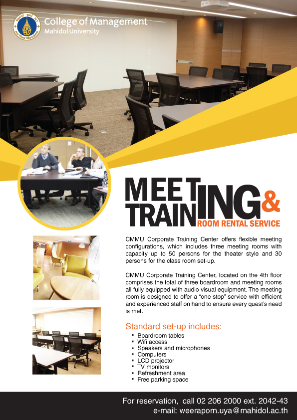 The College of Management Mahidol University (CMMU) provides innovative graduate programs in management, at the Master, post-Master, and Ph.D. levels. In addition to education and training in the area of General Management, the College offers Master of Management (M.M.) and Certificate of Advanced Graduate Study (C.A.G.S.) programs in key areas critical to Thailand's continuing development: Entrepreneurship Management, Innovation in Management, Marketing Management, New Technology Ventures, Human Resources Management and Financial Management. Our Ph.D. in Management offers the opportunity for capable professionals to refine and extend their expertise in management as well as their ability to create new knowledge. In addition to graduate education, CMMU also engages in corporate training, consulting, research, and in the development of management and management education tools. These programs provide critical links between the College and local, regional and international companies and organizations. They ensure that the knowledge focus of the College remains fresh, relevant and useful to the society we serve. Mahidol University has long been a leader in the "internationalization" of higher education in Thailand. The College of Management is committed to international partnerships as a means of developing knowledge resources for Thai society. To date, the College has developed dual degree programs, student and faculty exchanges, and special academic programs with universities in Belgium, Denmark, France, Germany, Norway, Portugal, China, Japan, South Korea, United Kingdom, the United States, Ecuador, Australia and New Zealand.