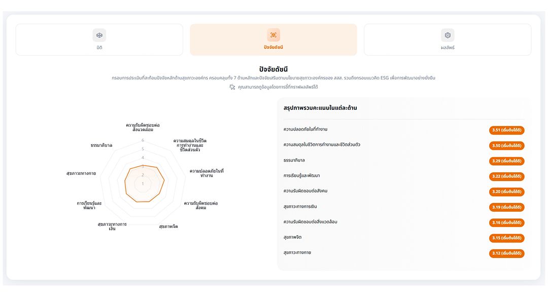 - เพื่อช่วยพัฒนาสุขภาวะองค์รวมขององค์กรแบบบูรณาการ ในมิติต่างๆ (มิติกาย ใจ ปัญญา สังคมและสิ่งแวดล้อม) ซึ่งมีความสำคัญต่อการขับเคลื่อนสุขภาวะที่ดี ความผูกพันของบุคลากร/พนักงาน และผลลัพธ์สู่ความยั่งยืน
