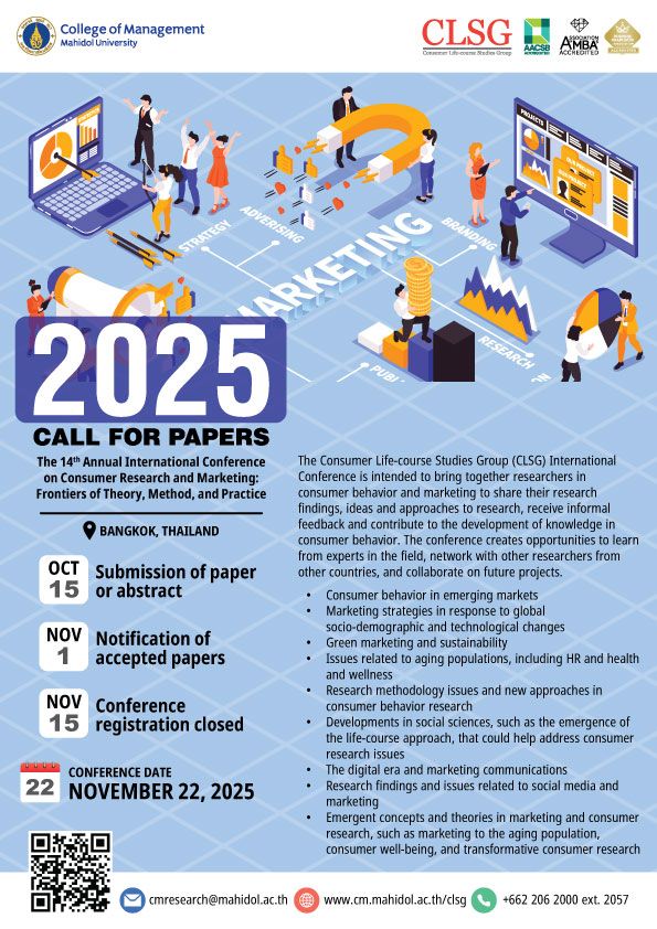 The Consumer Life-course Studies Group (CLSG) International Conference is intended to bring together researchers in consumer behavior and marketing to share their research findings, ideas and approaches to research, receive informal feedback and contribute to the development of knowledge in consumer behavior. The conference creates opportunities to learn from experts in the field, network with other researchers from other countries, and collaborate on future projects.We invite extended abstracts and papers in any of the following areas: